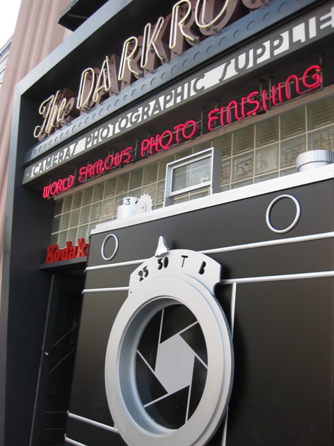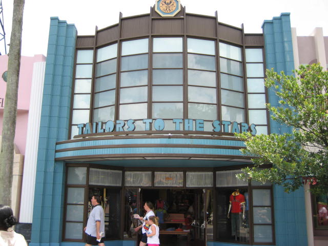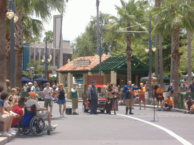 Hollywood Boulevard At Disney Hollywood Studios, guests enter the turnstiles onto the main street, Hollywood Boulevard, where reality blends into fantasy -- neon and chrome, art deco and modern architecture dominate the scenery. To enhance the old-time atmosphere, Streetmosphere characters like 1930s detectives, starlets and gossip columnists, populate the streets, interacting with the crowds they draw. Colorful shops and restaurants reinforce the feeling of yesteryear. |