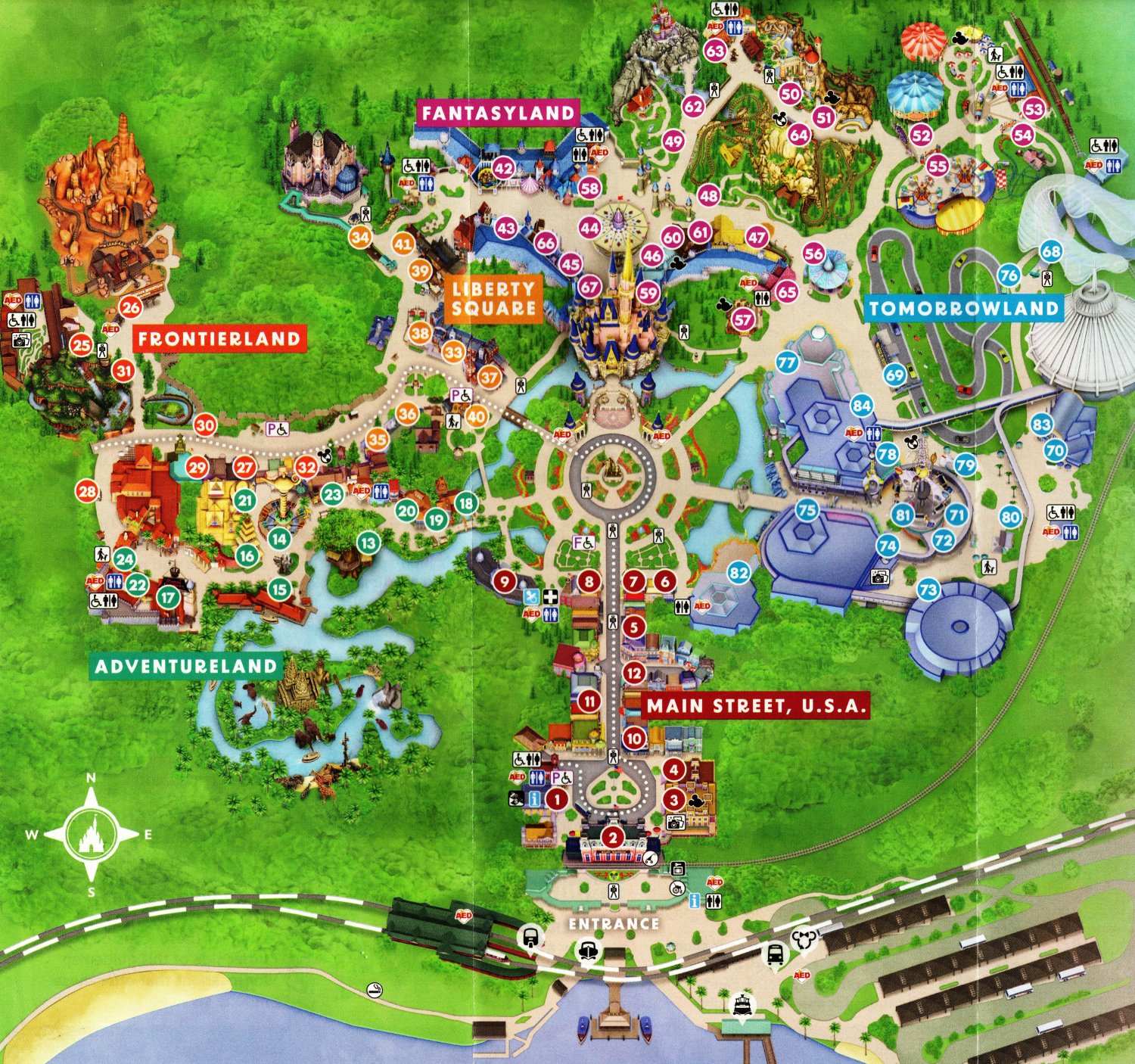 Magic Kingdom opened on October 1, 1971 as the first Walt Disney World theme park. The park includes six lands: Main Street USA, Liberty Square, Adventureland, Frontierland, Fantasyland, and Tomorrowland. Each area has rides, entertainment, restaurants, shops, and Disney characters. Popular rides include Space Mountain, Haunted Mansion, Jungle Cruise, Splash Mountain, Peter Pan's Flight, and Big Thunder Mountain Railroad. Many of the attractions make use of the new FastPass+ system, where you can make a reservation up to 2 months ahead of time so that you don't have to wait in line. Magic Kingdom also has fantastic parades and nightly fireworks. To visit everything at Magic Kingdom, plan on spending the whole day at the park. Arriving by ferryboat, resort buses, or swift monorail trains, guests pass through the turnstiles and under the old-fashioned Main Street Railroad station to six happy lands of yesterday, tomorrow and fantasy. |